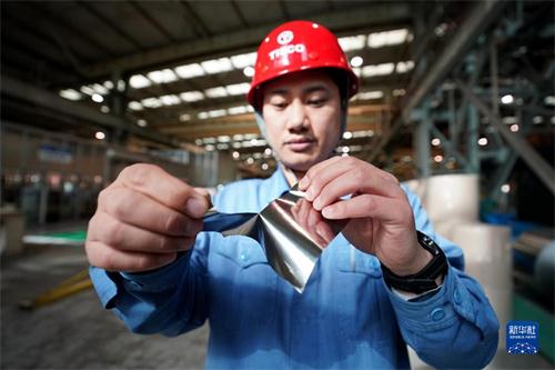 在中国宝武太钢不锈钢精密带钢有限公司,一名工作人员展示用手撕开超薄精密不锈带钢(2022年3月31日摄)。新华社记者 詹彦 摄