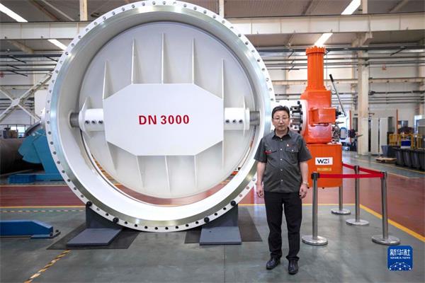 马玉山在位于宁夏吴忠市的吴忠仪表有限责任公司自动化产业园数字化装配车间中,左侧为该公司生产的DN3000三偏心蝶阀(9月12日摄)。 新华社记者 杨植森 摄