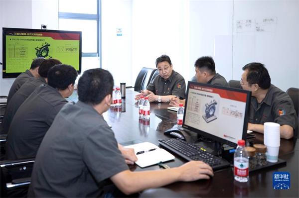 在位于宁夏吴忠市的吴忠仪表有限责任公司会议室内,马玉山(中)与技术人员开会(9月12日摄)。 新华社记者 杨植森 摄